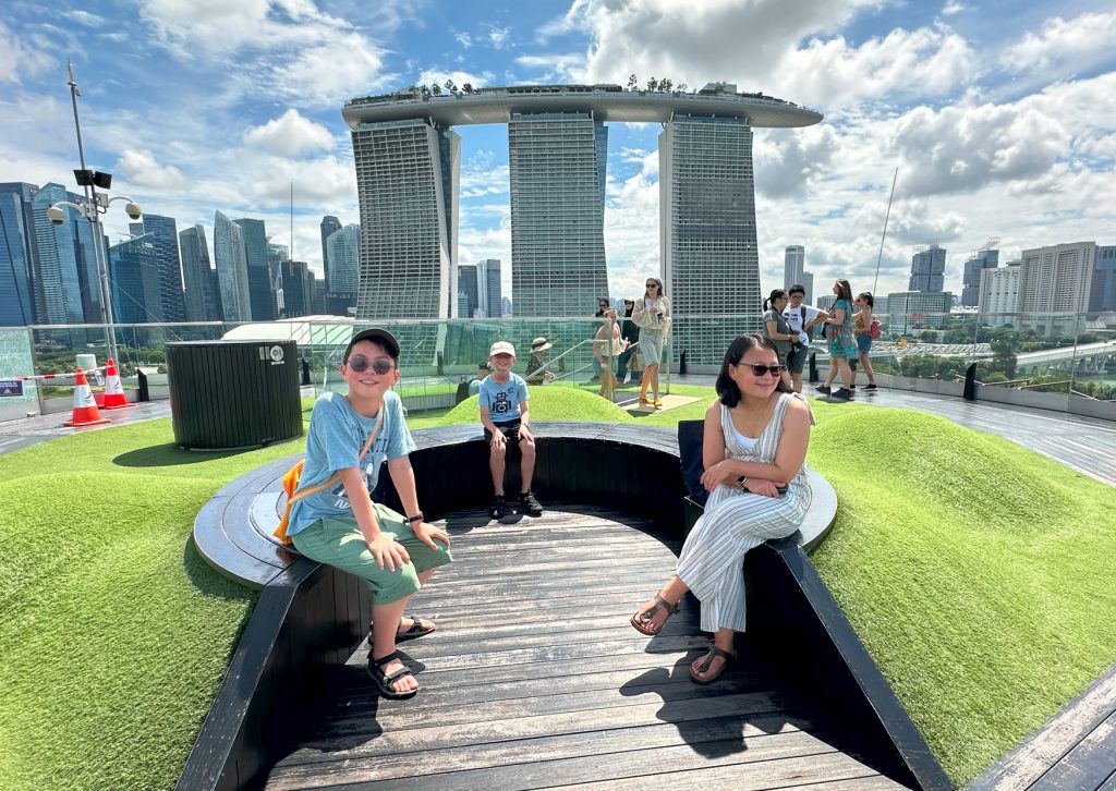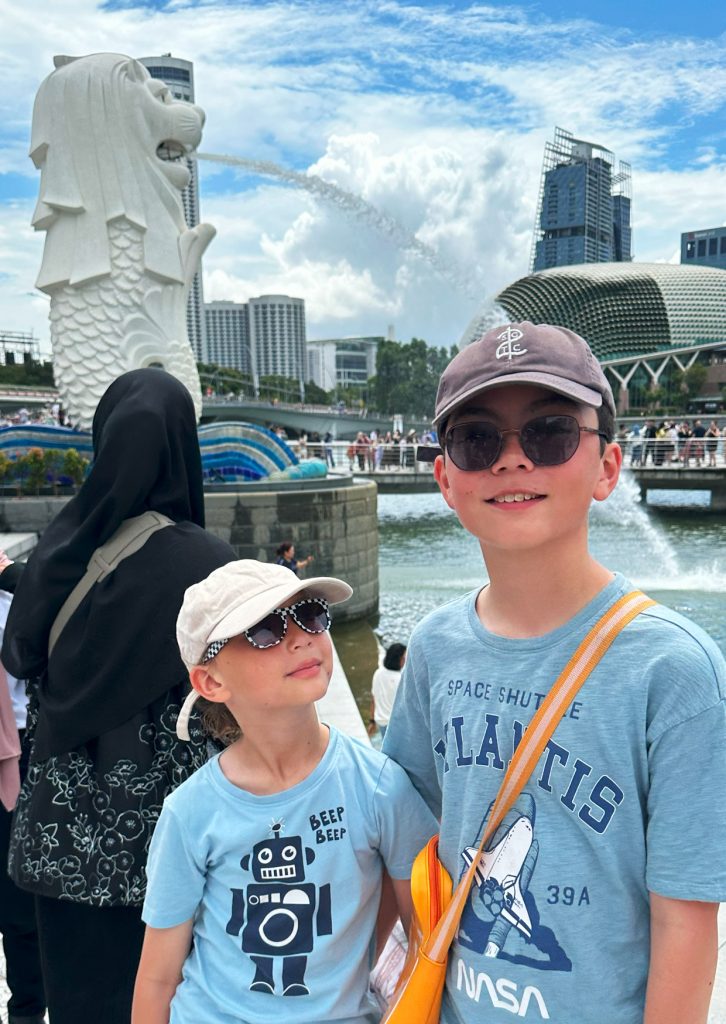 In Singapore we went sightseeing first we saw the Merlion which is a fountain of a lion with a fish’s bottom half instead of its hindquarters.